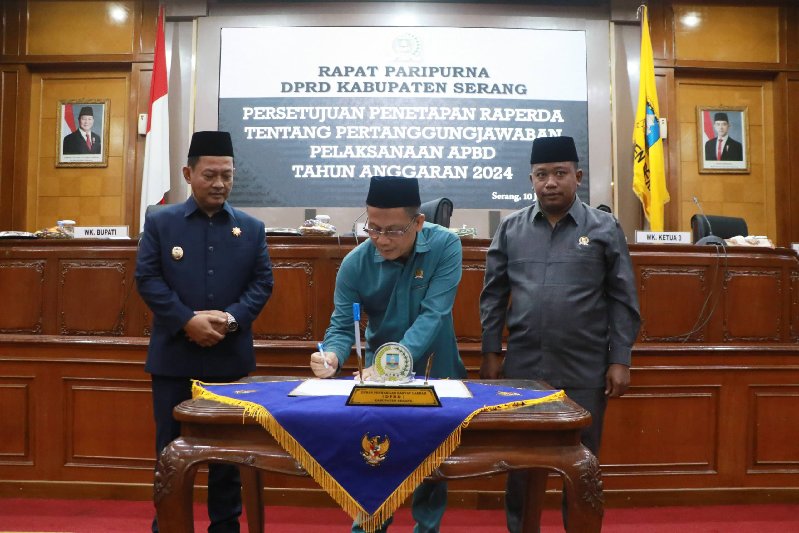 Harmonyfm-Serang, Dewan Perwakilan Daerah Rakyat (DPRD) Kabupaten Serang menetapkan Rancangan Peraturan Daerah (Raperda) menjadi Peraturan Daerah (Perda) tentang Pertanggungjawaban Pelaksanaan Anggaran Pendapatan Belanja Dawerah (APBD) Tahun 2024. Penetapan melalui Rapat Paripurna DPRD Kabupaten Serang yang dipimpin Wakil Ketua II, Agus Wahyudiono di gedung dewan setempat pada Kamis, 10 Juli 2025.